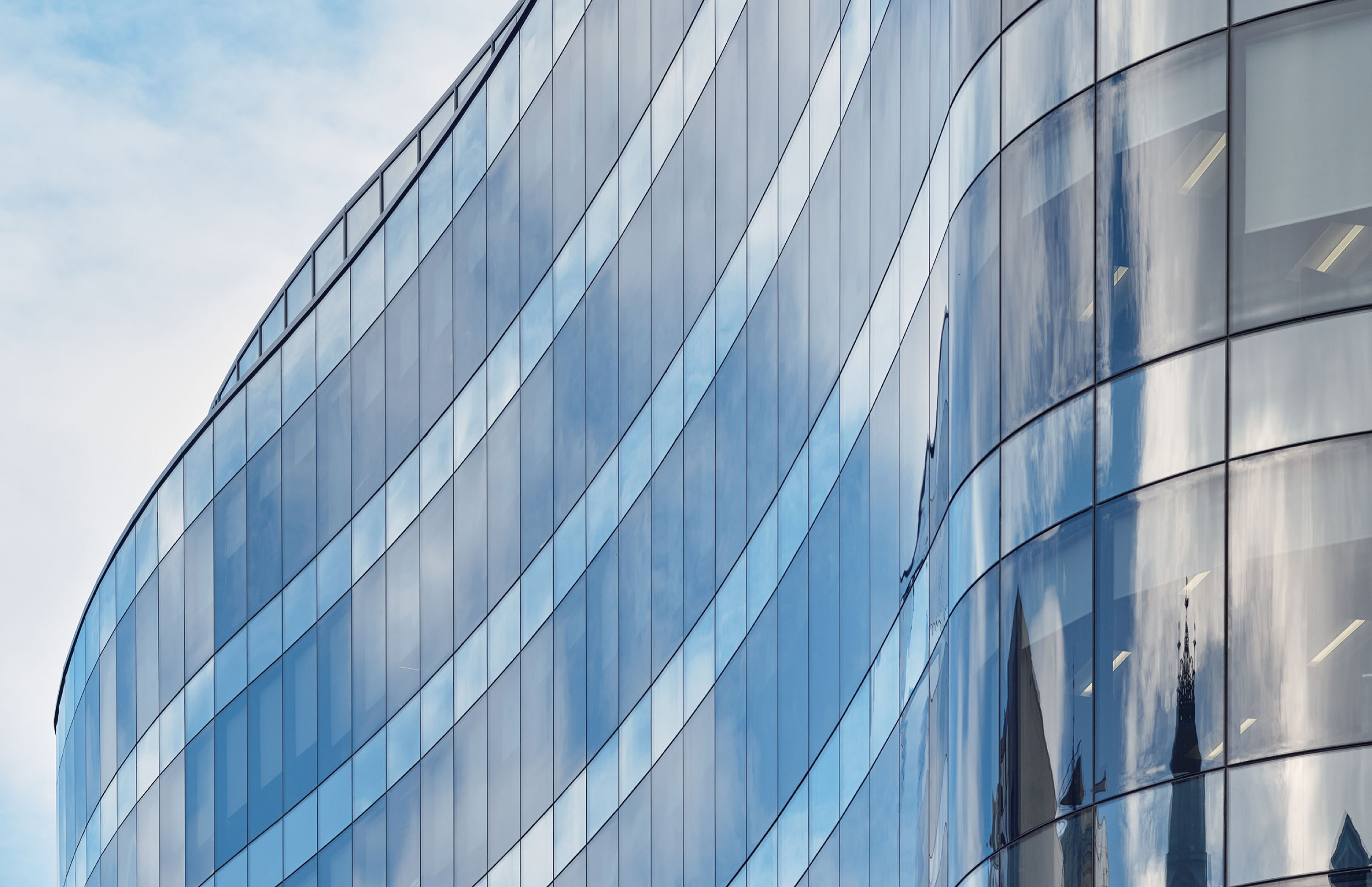 A smoked glass curtain wall encases the curve, engineered for high performance, low energy demand, and visual impact.